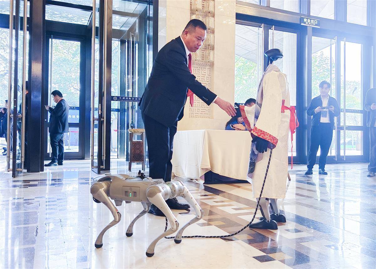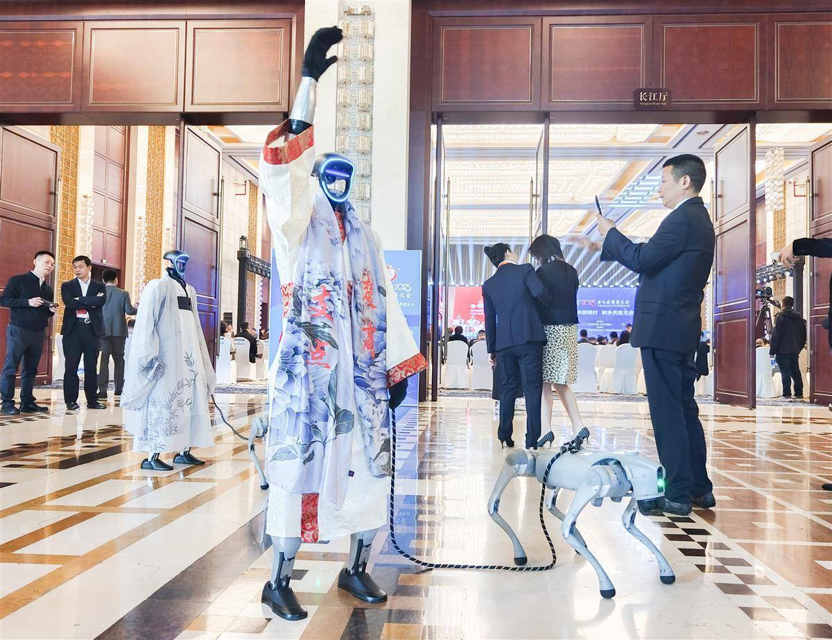 10月29日009配资,参会楚商代表在会场外和人形机器人互动。